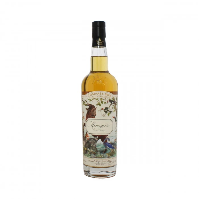 A limited-edition blended whisky from Compass Box, Menagerie is a blend of re-charred barrels, a refill hogshead, refill sherry seasoned butts, a custom French oak barrel, and a re-charred hogshead. When creating this expression, lead whisky maker James Saxon chose whiskies that boast somewhat animalistic hints; this blended comprises single malt whiskies from Mortlach, Deanston, Laphroaig, and Glen Elgin Distilleries, with blended malt from the Highland Malt Blend Distillery.